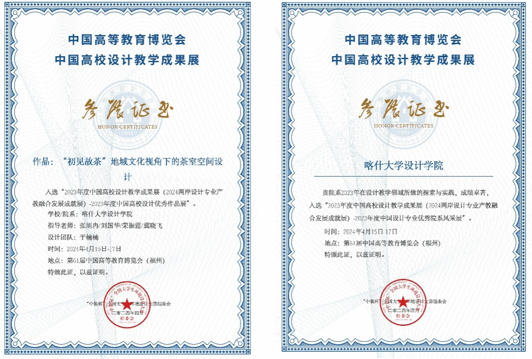 2024年4月13日,我校设计学院应“中装杯”全国大学生环境设计大赛组委会邀请,参加中国高等教育博览会。参展作品为第9届“中装杯”全国大学生环境设计大赛获奖作品,我校获得二等奖。设计学院派环境设计教研室主任刘国华、教师荣振霆前往福建·福州参展。