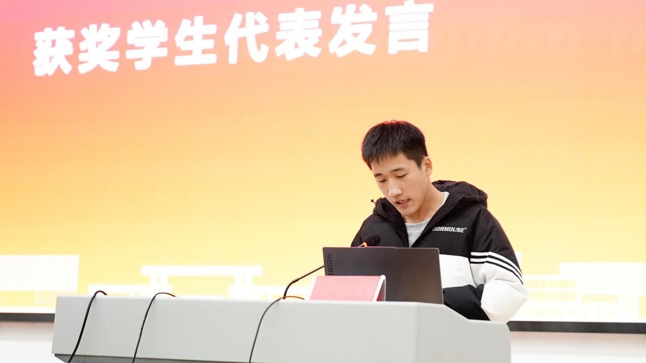 会议第二项进行颁奖仪式,由学院领导及部分教师对获奖学生代表颁发证书。2007班张泽堂同学作为学生代表,分享比赛中的心得感悟以及自身在学习过程中学到的专业知识。