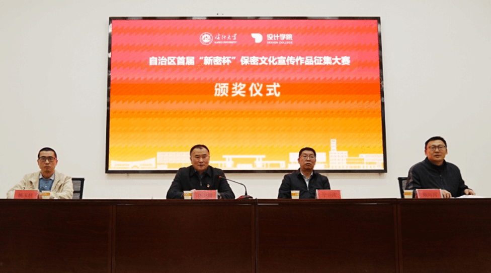 为表彰在自治区首届“新密杯”保密文化宣传作品征集大赛中获奖的教师和学生,树立典型,向优秀师生学习,提升教学质量和学科竞赛的积极性,设计学院于2024年3月20日举行大赛颁奖仪式。校党委常委、副校长孙卫国、校党委常委、统战部部长宁立庆、设计学院办公室主任杨玉柱出席,颁奖仪式由设计学院副书记戴海涛主持。
