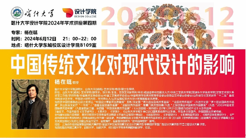 6月13日,设计学院在东城校区西楼B109室,举办2024年第四场专家系列讲座活动。主讲嘉宾为喀什大学设计学院副院长、山东大学(威海)艺术学院硕士生导师杨在珽教授,本次讲座以“中国传统文化对现代设计的影响”为主题。设计学院办公室主任杨玉柱,艺术设计学教研室主任谷金昊,副主任从琳,以及艺术设计学教研室全体教师和部分学生参加本次讲座活动。