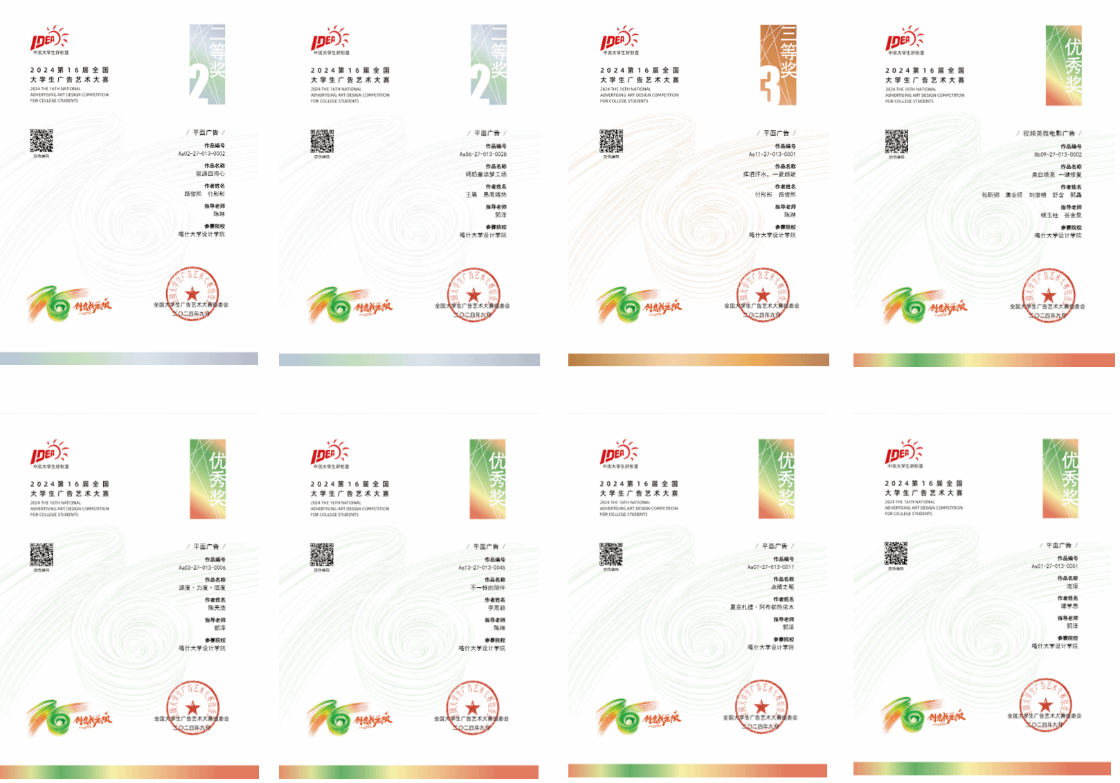 由全国大学生广告艺术大赛组委员会举办的2024年第16届全国大学生广告艺术大赛全国总决赛获奖名单于公布,我院师生喜报频传,再创佳绩!在此次比赛中,我院学子在专业老师的指导下,共获国家级奖项8项,其中国家级二等奖2项,国家级三等奖1项,国家级优秀奖5项;省部级奖项59项,其中省部级一等奖4项,省部级二等奖15项,省部级三等奖40项。