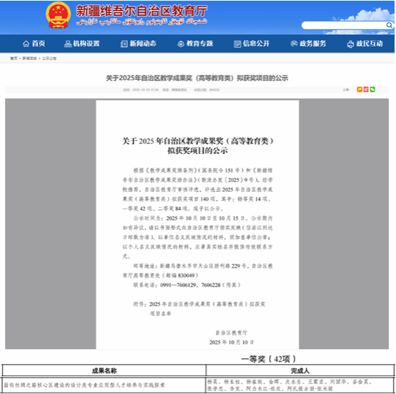 近日,自治区教育厅正式公布 2025 年高等教育教学成果奖评选结果,喀什大学设计学院杨昊副教授牵头完成的《面向丝绸之路核心区建设的设计类专业应用型人才培养与实践探索》成果,依托喀什大学设计学院近十年的教育教学改革和专业积累,凭借扎实的改革成效与显著的育人价值,斩获自治区级教学成果奖一等奖!这是我院今年继获批 “教育部第三批国家级一流本科课程” 后,再度斩获省级最高级别教学荣誉,为南疆设计教育改革做出了重要努力。
