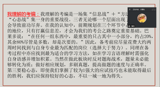 在互动答疑环节,线上会议室气氛热烈。同学们围绕复习资料选择、备考压力疏解、特定岗位发展前景等具体问题踊跃提问,两位学长结合自身见闻与思考,给予了细致、诚恳的解答,提供了多条宝贵且实用建议。
